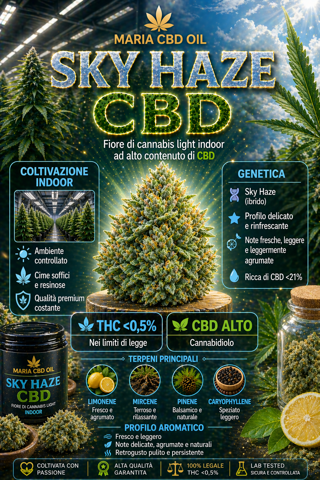 Sky Haze tiene un aroma fresco y ligeramente dulce, con notas florales que recuerdan a la primavera y un ligero toque de pino. La fragancia es a la vez delicada y persistente y ofrece una experiencia olfativa equilibrada, perfecta para quienes aman los aromas ligeros pero refinados. El aroma natural de Sky Haze es el resultado del cultivo de interior que permite exaltar cada matiz de los terpenos presentes en la flor.