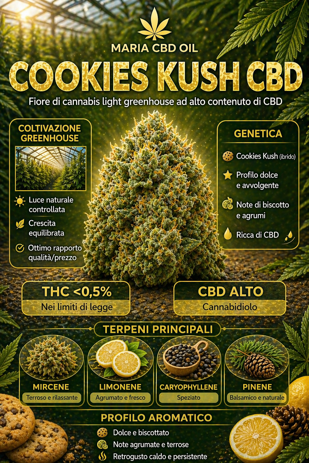 Con un alto contenido de cannabinoides, Cookies Kush ofrece una experiencia recreativa de nivel superior, garantizando efectos físicos relajantes y narcotizantes, combinados con sensaciones mentales de joya, euforia y serenidad. Esta variedad es perfecta para acompañar momentos de relajación, mejorar las noches o favorecer un sueño profundo. Además de los usos recreativos, Cookie Kush ha demostrado un potencial considerable terapéutico, eficaz en aliviar el estrés, dolor, insomnio, inapetencia y alteraciones de la presión ocular, realzando de esta manera la no psicoactividad del CBD.