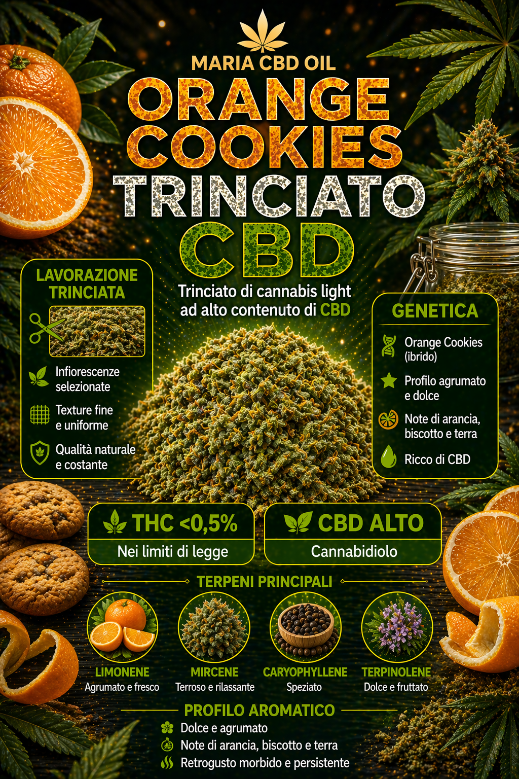 Orange Cookies es un picado de CBD que combina la dulzura de los cítricos con la riqueza de las galletas recién horneadas, creando una experiencia única para el consumidor. Este producto destaca por su alto contenido en CBD y su acogedor aroma, por lo que es ideal para aquellos que buscan alivio sin efectos psicoactivos. Procedente de cultivo ecológico, Orange Cookies es la elección perfecta para los amantes de los sabores dulces e intensos, garantizando una calidad superior y una agradable experiencia de consumo.